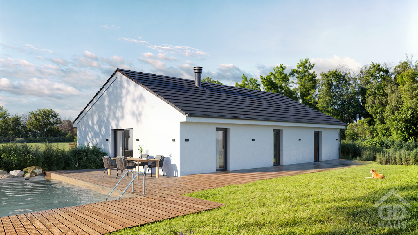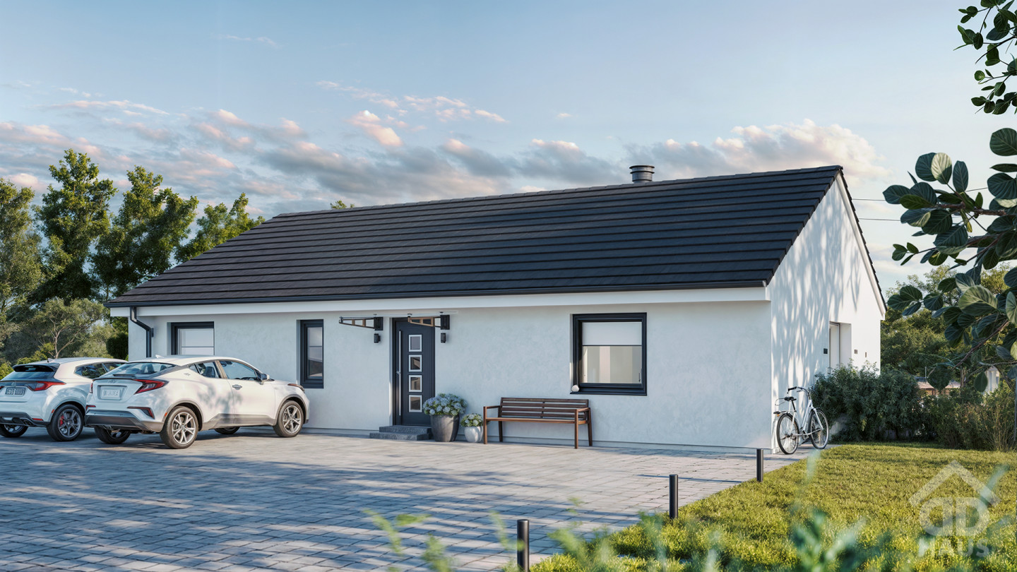 MCELY I. je malý přízemní bungalov, který však plně uspokojí nároky na bydlení 3-4 členné rodiny. Jeho moderní vzhled dotváří prosklená fasáda, která opticky propojuje zahradu s vnitřními obytnými prostory domu. Propojení obývacího pokoje, jídelny a kuchyně zaručuje společné soužití celé rodiny. K domu lze přistavět garáž na boční straně.